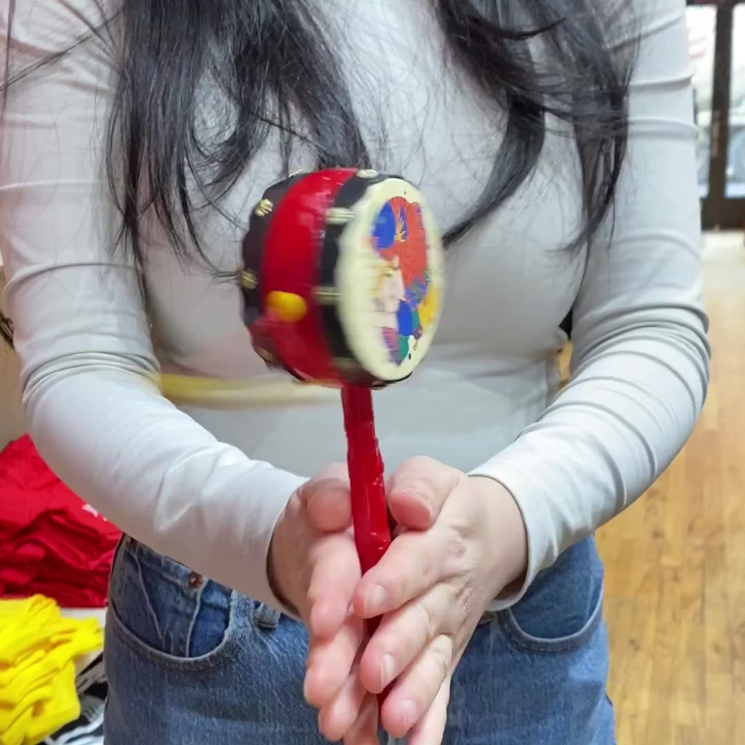 Hold the handle between two hands and twist back and forth. That's how easy it is to play this spindle drum. Also known as a pellet drum, it's traditionally used in Buddhist rituals. However, it's also a fun (and noisy!) toy for all ages.