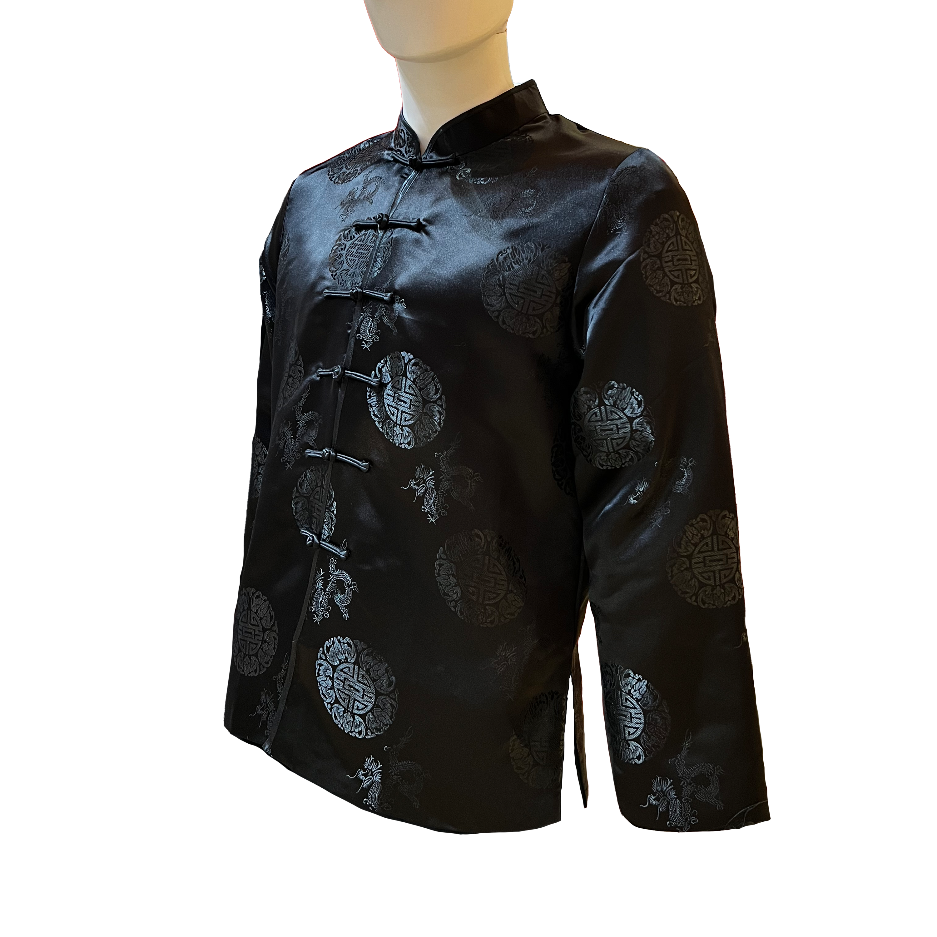 Tang-style jacket with pankou buttons and mandarin collar. Sumptuous brocade with smattering of the longevity character (for long life) and the dragon (embodying wisdom, beneficence, and power).