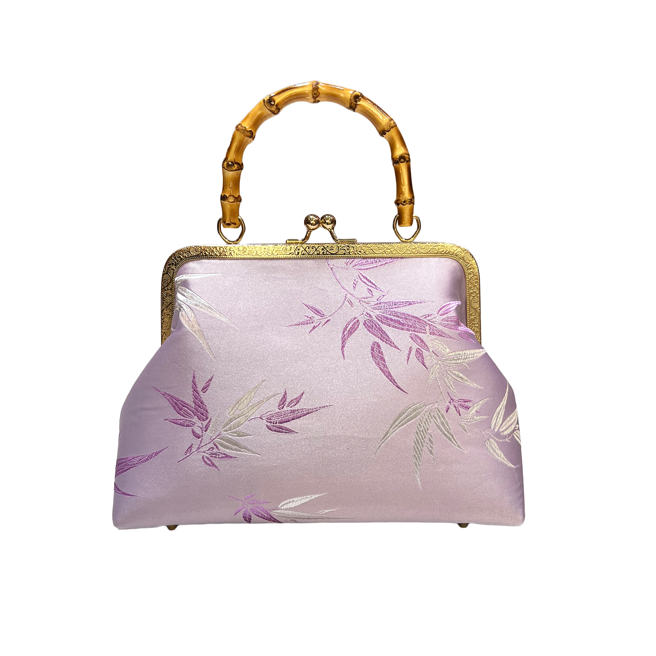 Elegant handbag featuring a distinctive bamboo handle, adorned with a charming bamboo leaf pattern, and secured with a stylish kiss-lock clasp. Available in multiple colors to complement any outfit.